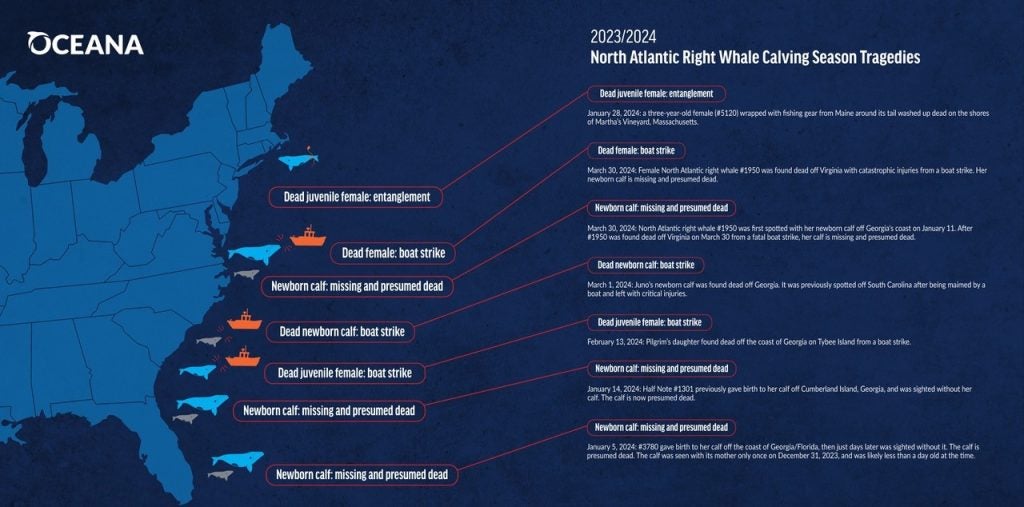 Oceana explains: “At high speeds, ships cannot manoeuvre to avoid them, even with advanced monitoring technologies, and the whales swim too slowly to be able to move out of the way. Limiting vessel speeds to 10 knots is estimated to reduce a North Atlantic right whale’s risk of death from a boat over 65 feet by between 80% and 90%.”
