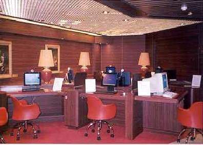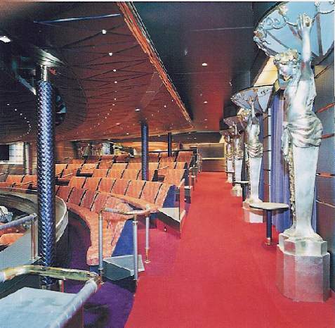 The 217-seat wajang theatre, located on the promenade deck, is used for lectures, meetings and religious services, as well as current films. The seats have folding writing tables and headphone boxes. Next to the theatre is the 36-seat java cafe, offering espresso drinks for informal coffee breaks, and the seven-station internet centre.