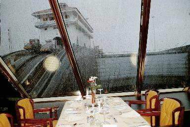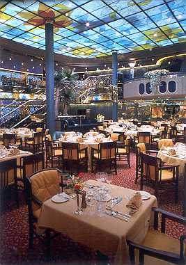 The main dining facility is the la fontaine dining room that features colourful and expansive stained glass ceiling. It is located at the stern of the ship, allowing a wall of windows to provide expansive ocean views on three sides. It can seat 747 across two levels connected by curved staircases.