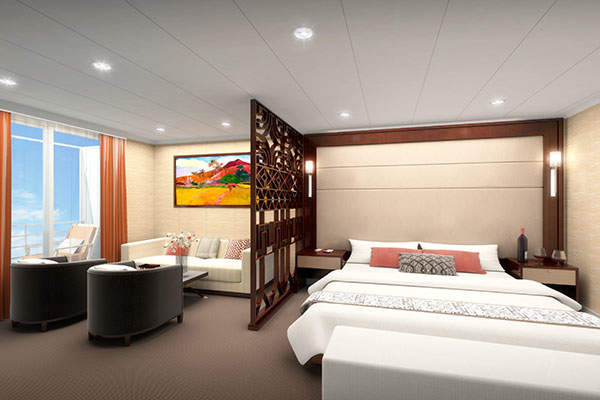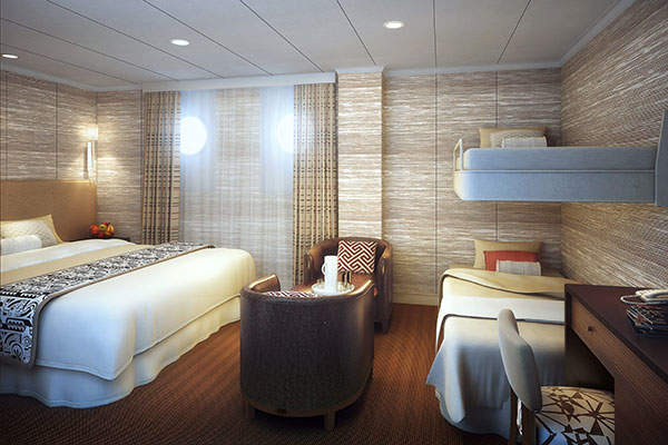 Each suite will feature a queen-size bed and a sofa bed, and can accommodate up to three people. Staterooms will be available for single, double or quadruple occupancy. Private bathrooms with showers will be included in each guest room.