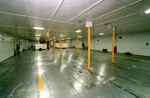 Below, on the main deck, a lounge with aircraft style seating for 128 passengers has been provided forward of the vehicle deck. Four aisles separate the seating blocks, which provide for seating configurations of three across the entire lounge.