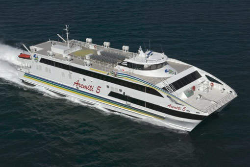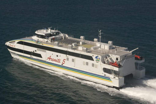 The Aremiti 5 is an Austal Auto Express 56 ferry which works between the French Polynesian islands of Papeete, Morea and Bora Bora. It has an overall length of 56.6m or 49.8m at the waterline. The vessel’s beam is 14m, its moulded depth 5m and it has a 1.9m draught. The maximum deadweight is 117t.