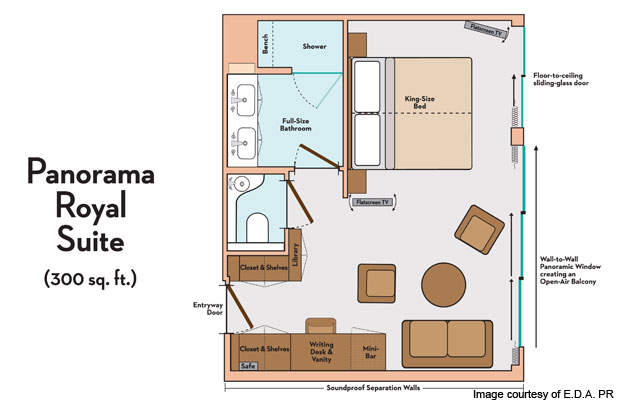 Deluxe staterooms are built over 200ft², while Royal Suites occupy 300ft².