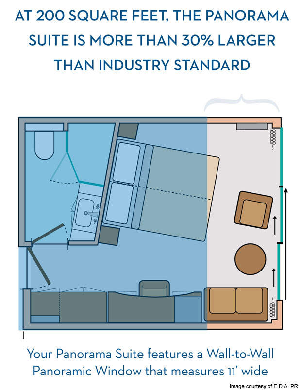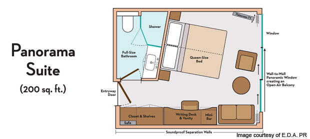 The ship’s advanced design includes spacious public areas, two full decks of suite accommodation, panoramic windows in all public areas, enhanced soundproofing, designer lighting and no-smoking interiors.