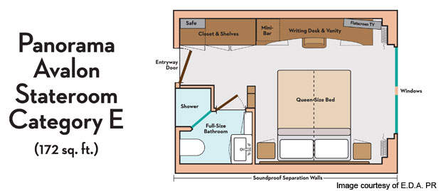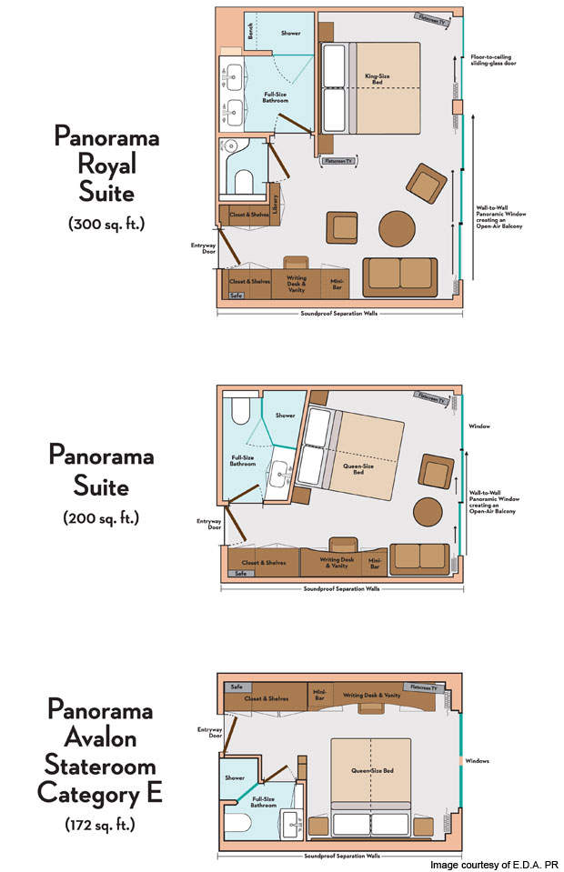 Apart from 17 Avalon Deluxe Staterooms, the ship features 66 newly designed Panorama Suites located on the top two decks. Deluxe Staterooms have 172ft² of living space while Panorama Suites have 200ft² of living space. The staterooms are 30% larger than any other river cruise operating in Europe.