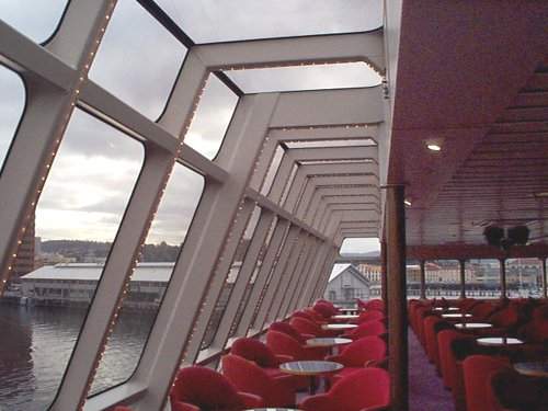 All passenger areas are located on a single level, reached via two entrances midships and two aft, port and starboard. The vessel has a first-class saloon stretching from the bow to two midships shops, and tourist class elsewhere.