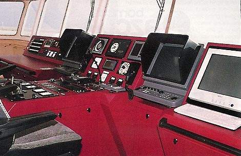 The wheelhouse lies on top of a five-tier deckhouse. The Nav Aids include an ARPA radar, an EPA radar, two Inmarsat C terminals, two GPS Navigators, a GMDSS radio telephone system, two radio telephones with DSC modems, an echosounder, a doppler speed log, a Navtex receiver, a weather chart receiver, two radar transponders, a gyrocompass, repeater compass, magnetic compass and autopilot.
