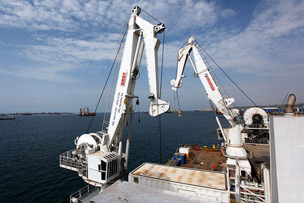 The main winch of the main crane supplied by MacGregor Cargotec has a lifting capacity of 150t at an outreach of 2,500m, while its auxiliary winch has a lifting capacity of 20t at an outreach of 2,500m. The main winch of the crane supplied by SMST has a lifting capacity of 40t at an outreach of 2,500m.