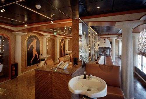 On deck 3, in front of the main dining room’s upper level, is the conference room, seating some 60 guests, and the deco lounge (foyer lounge). Beyond the Atrium is the shopping area (fashion boulevard).