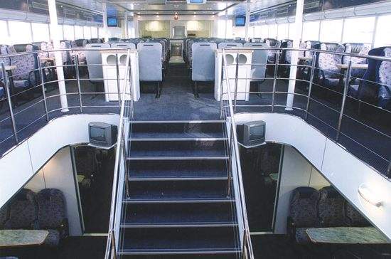 Amenities for passengers on-board include a bar and kiosk aft on both decks, a galley and a toilet block on the main deck. Overhead, luggage racks are fitted along port and starboard aisles, and four luggage stowage areas are located externally, aft on the main deck.