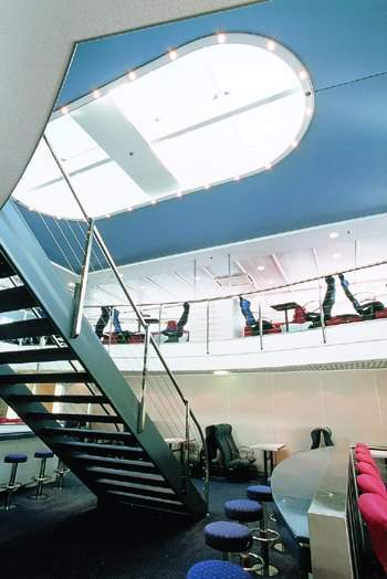 While certified to carry 900 passengers, Scandlines Cat-Link A/S has chosen to limit Cat-Link V’s capacity to 800. Passengers enter the interior aft via the vehicle deck stairs or the terminal gangway. A port passage provides access for disabled passengers. A central atrium-style lounge located midships on tier 2 provides the focal point for all passenger services.