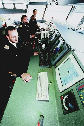The ship’s position is provided by a Decca MX400B, a six-channel GPS with built-in DGPS Beacon receiver. Primary navigation is performed by the two Decca BridgeMaster II 250 Series radars. The Navigator’s radar uses a 30kW S-Band transceiver transmitting at 3GHz with a 12ft scanner. The Captain’s radar is an X-Band 25kW unit, transmitting at 9.4GHz into a 6ft scanner. A Skipper GDS101 with a 50kHz transceiver provides optimum sea bottom detection. Long-range communications in the 2MHz to 30MHz band is catered for by a Skanti TRP7200 Transceiver. Two Skanti VHF3000 25W transceivers operating in the frequency range 155MHz to 163MHz provide short-range communications.