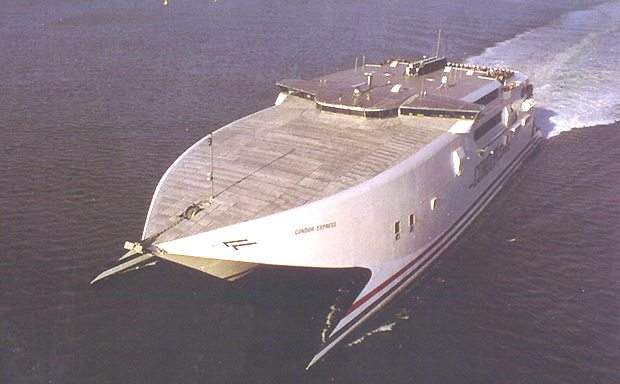 Condor Express has a length of 86.26m, while its overall beam measurement excluding fenders remains at 26m.